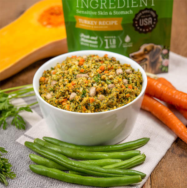 Turkey, Flaxseed, Carrots, Broccoli, Green Beans, Cabbage, Pumpkin, Sweet Potato, Chia Seeds, Butternut Squash, Spinach, Tricalcium Phosphate, Organic Turmeric, Ginger, Dandelion, Inulin, Zinc Proteinate, Iron Proteinate, Taurine, Selenium Yeast, Vitamin E Supplement, Copper Proteinate, Nicotinic Acid, Manganese Proteinate, L-Carnitine, Vitamin A Acetate, d-Calcium Pantothenate, Thiamine Mononitrate, Pyridoxine Hydrochloride, Riboflavin Supplement, Vitamin B12 Supplement, Biotin, Calcium Iodate, Vitamin D3 Supplement, Folic Acid, Bacillus licheniformis, Bacillus subtilis, Bromelain, Papain