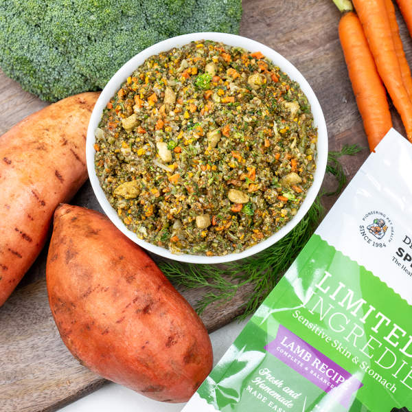 Lamb, Carrots, Flaxseed, Broccoli, Green Beans, Cabbage, Pumpkin, Sweet Potato, Chia Seeds, Butternut Squash, Spinach, Tricalcium Phosphate, Turmeric, Ginger, Dandelion, Lamb Liver, Inulin, Zinc Proteinate, Iron Proteinate, Taurine, Selenium Yeast, Vitamin E Supplement, Copper Proteinate, Nicotinic Acid, Manganese Proteinate, L-Carnitine, Vitamin A Acetate, d-Calcium Pantothenate, Thiamine Mononitrate, Pyridoxine Hydrochloride, Riboflavin Supplement, Vitamin B12 Supplement, Biotin, Calcium Iodate, Vitamin D3 Supplement, Folic Acid, Bacillus licheniformis, Bacillus subtilis, Bromelain, Papain