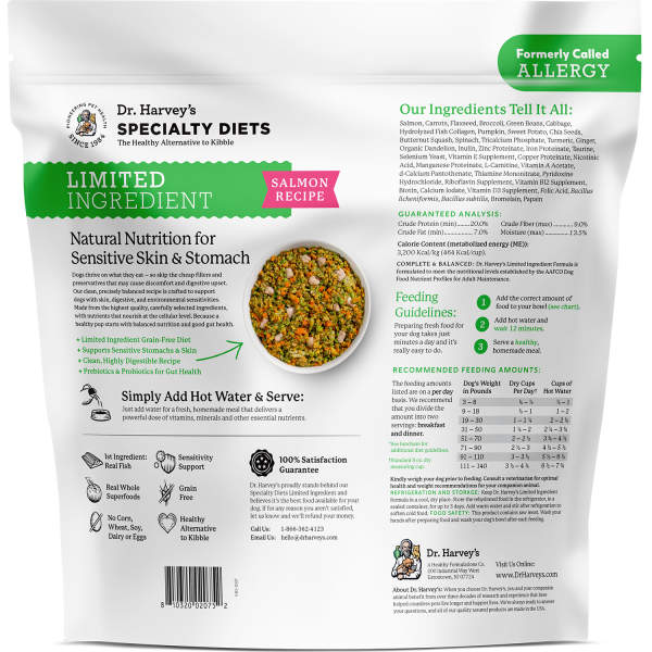 My Frenchie has severe food sensitivities, so I have been trying to find a complete formula for her that doesn’t contain anything she is sensitive to. It has been difficult. Dr. Harvey’s “Allergy” formula has ended my search. She loves it, it’s nutritious, and it doesn’t contain anything that she’s sensitive to.